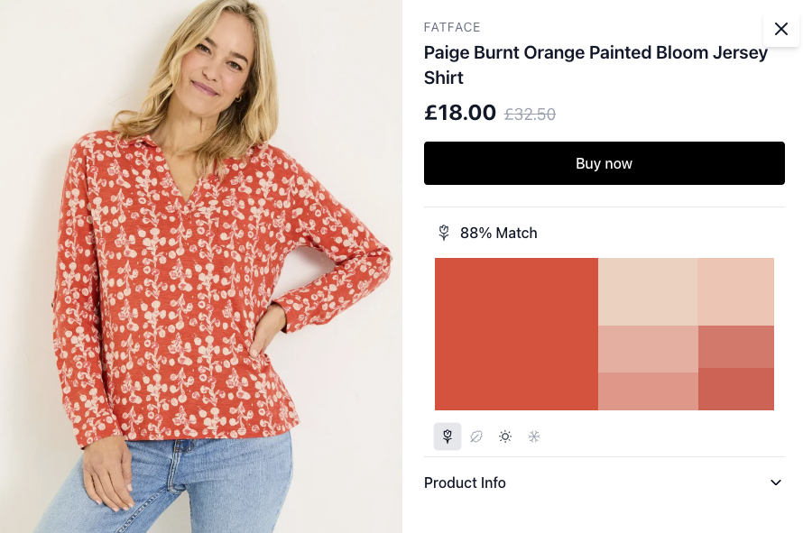Every item on Colourcat is analysed using AI to understand its exact colour composition and matched against the four seasonal palettes. Each item is then assigned a season and given a season score, showing how closely it aligns with each palette. This helps you quickly find the clothes in your favourite colour palettes.